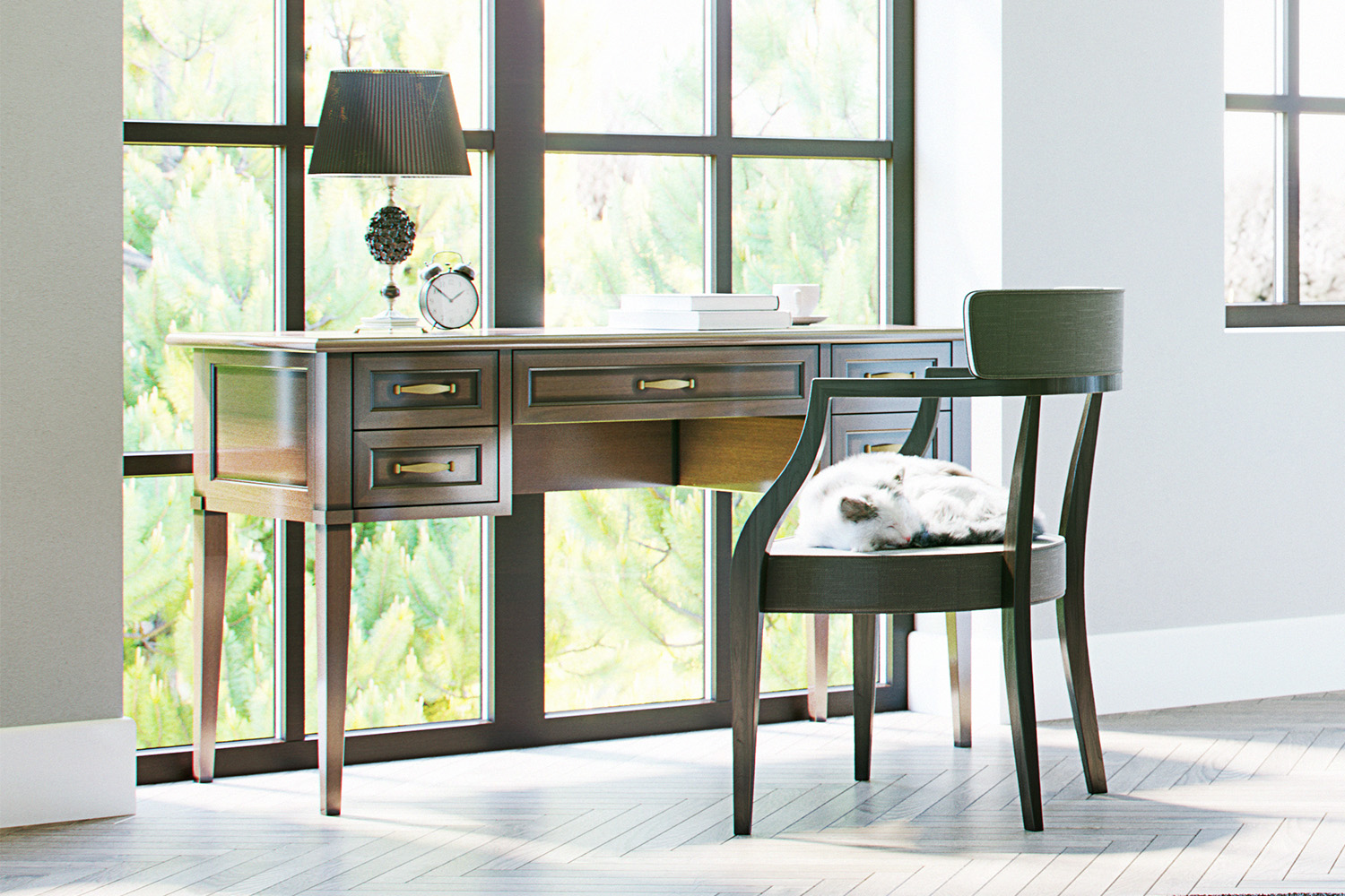 Строгие филенки, высокие тонкие ножки, выступающие края столешницы подчеркивают классический дизайн. Традиционное оформление соблюдено во всем, начиная от теплого древесного цвета «старый клен» и заканчивая четкой геометрией и симметричностью изделия. Латунная фурнитура оформлена в оттенке «античная бронза». «Адажио» идеально впишется в обстановку в стиле классика, модерн, ар-деко.