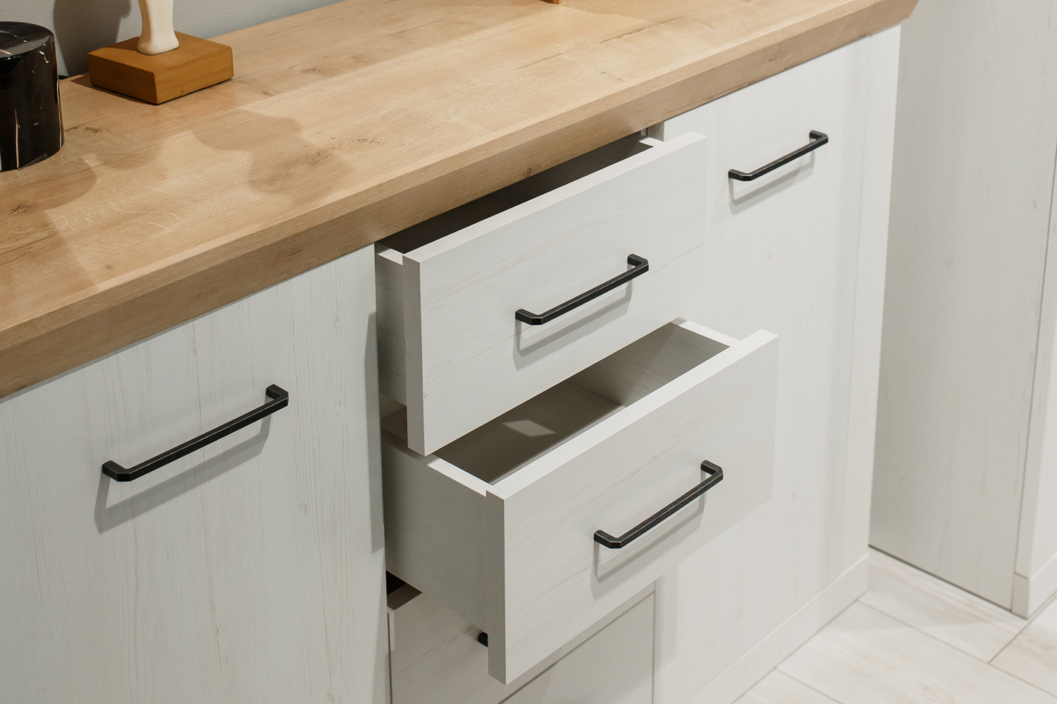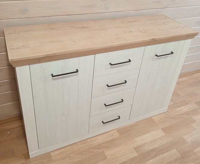 Эффектный напольный комод в базовом цвете станет отличным решением при выборе системы хранения для спальни или гостиной в стиле кантри, прованс или облегченный лофт. Корпус мебели в оттенке «блан-шене» гармонично сочетается со столешницей, текстурированной под древесину «дуб бунратти». Края крышки изделия несколько выступают за пределы каркаса и оформлены в скошенном варианте. Гладкую поверхность фасадов подчеркивает минималистичная металлическая фурнитура, выполненная под «античное железо черное».