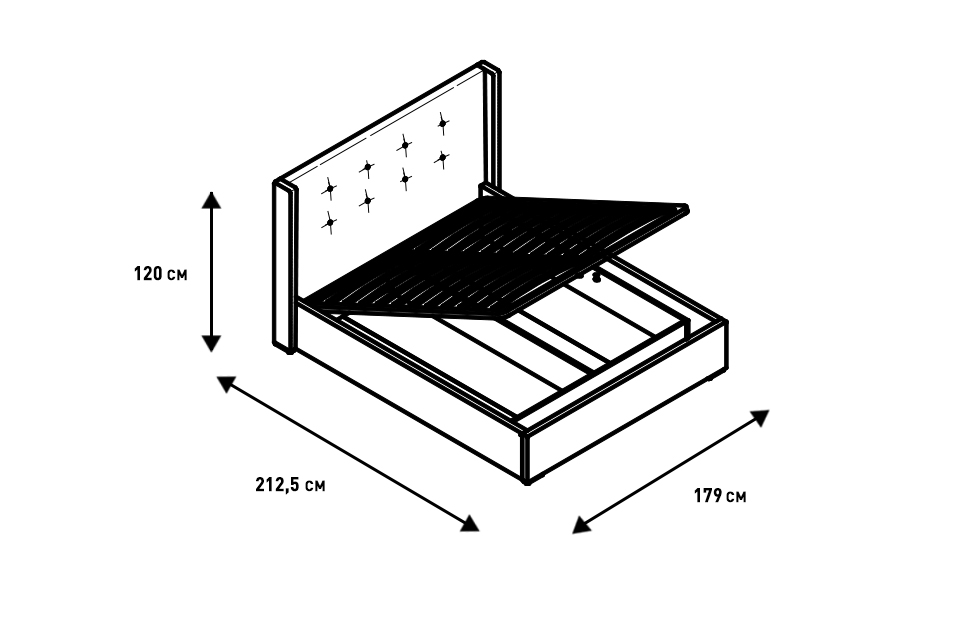Каркас изделия изготовлен из ламинированной ДСП. В комплект входит основание из металлической рамы, оснащенной упругими латами, которые придают спальному месту ортопедические свойства. Конструкция также снабжена подъемником и просторным ящиком для белья.