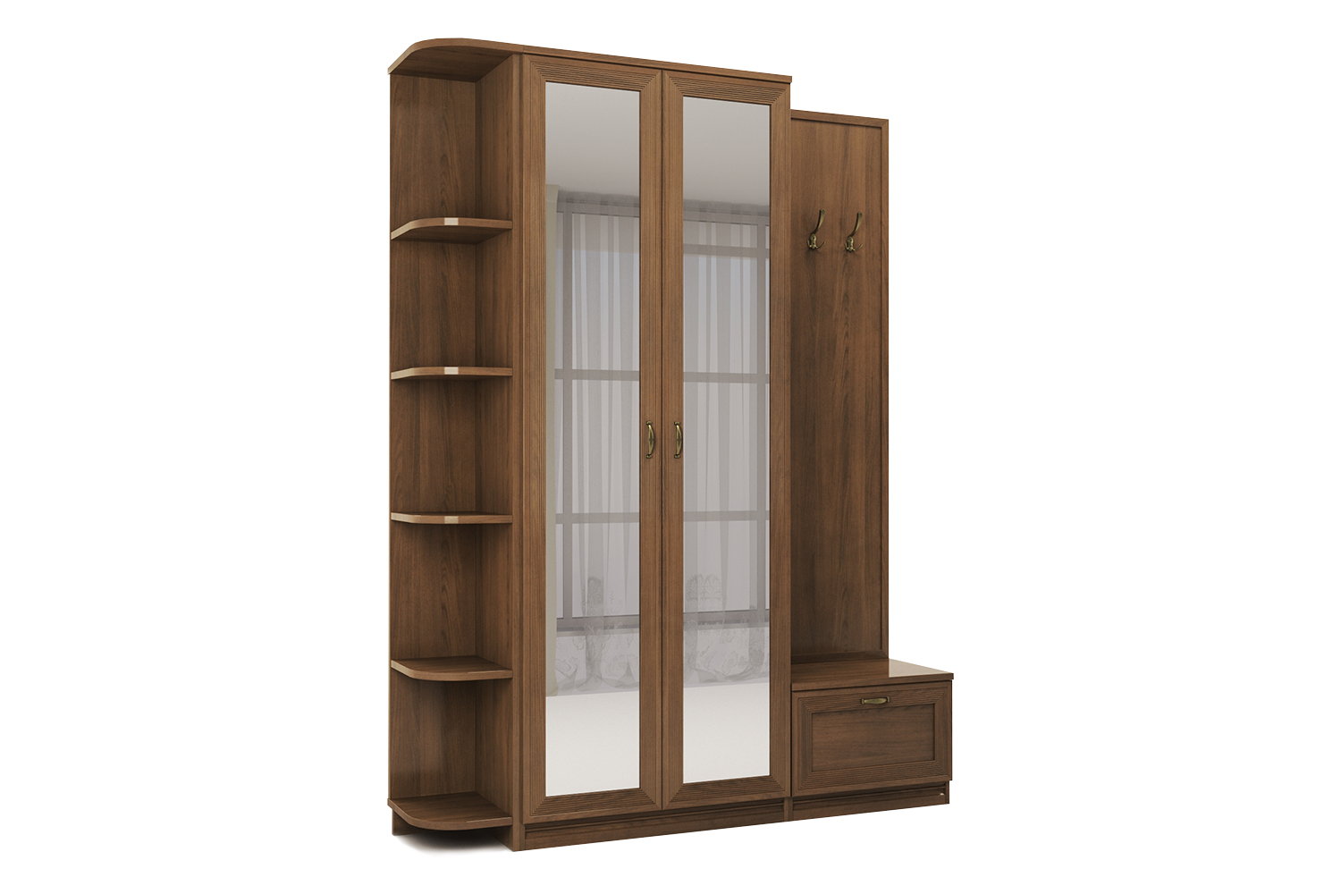 • Вместительный шкаф и вешалки позволят разместить верхнюю одежду, тумбочка сохранит в чистоте обувь, а аксессуары на стеллаже подчеркнут выбранный вами стиль интерьера.