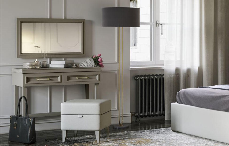 - элегантный туалетный столик с двумя выдвижными ящиками на высоких ножках;