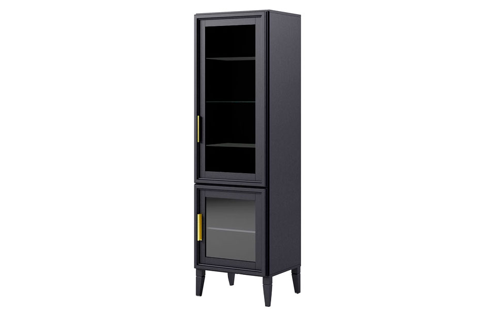 • В нижней части за распашной стеклянной дверцей одно отделение со шпонированной внутренней полкой, в верхней части за распашной стеклянной дверцей отделение с тремя стеклянными полками;