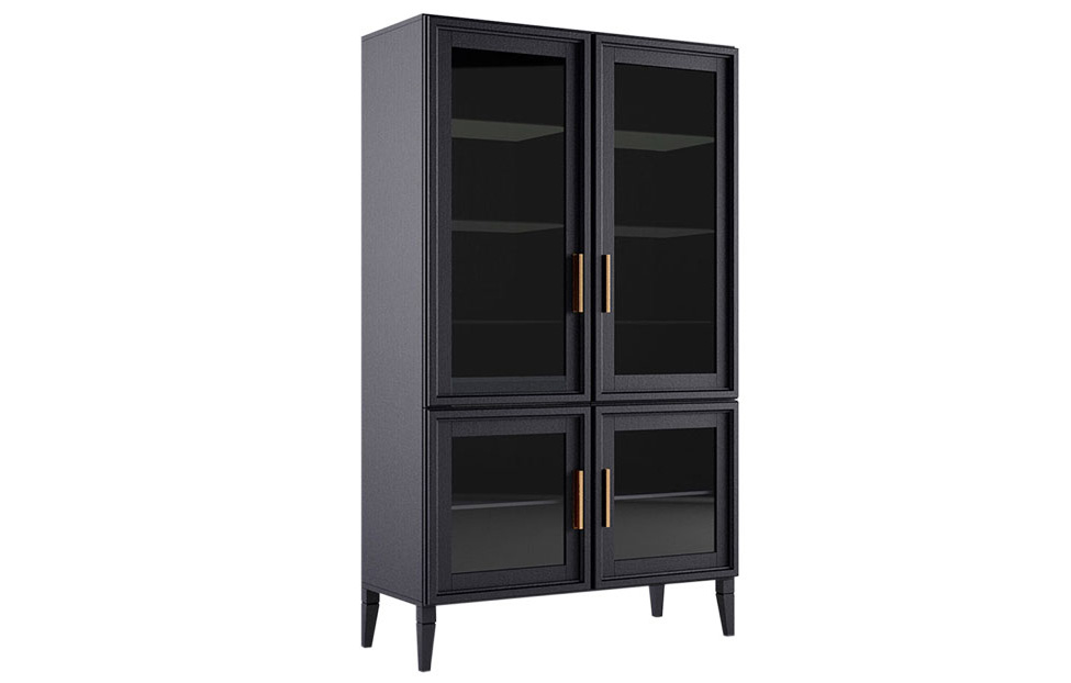Модель состоит из четырех основных отделений. Верхняя часть комплектуется стеклянными, а нижняя — шпонированными съемными полочками. Стеклянные дверцы позволяют ненавязчиво демонстрировать содержимое окружающим. Петли и направляющие с доводчиками от немецкого бренда Hettich обеспечивают плавную и бесшумную эксплуатацию мебели. Шкаф поставляется в разобранном виде, покупателям доступна доставка и сборка на месте. Изделие устойчиво к опрокидыванию, не нуждается в креплении.