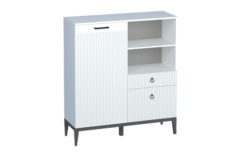 • Наполнение шкафа: полка в открытой части, три полки за высоким фасадом и 2 ящика (малый и большой).