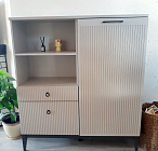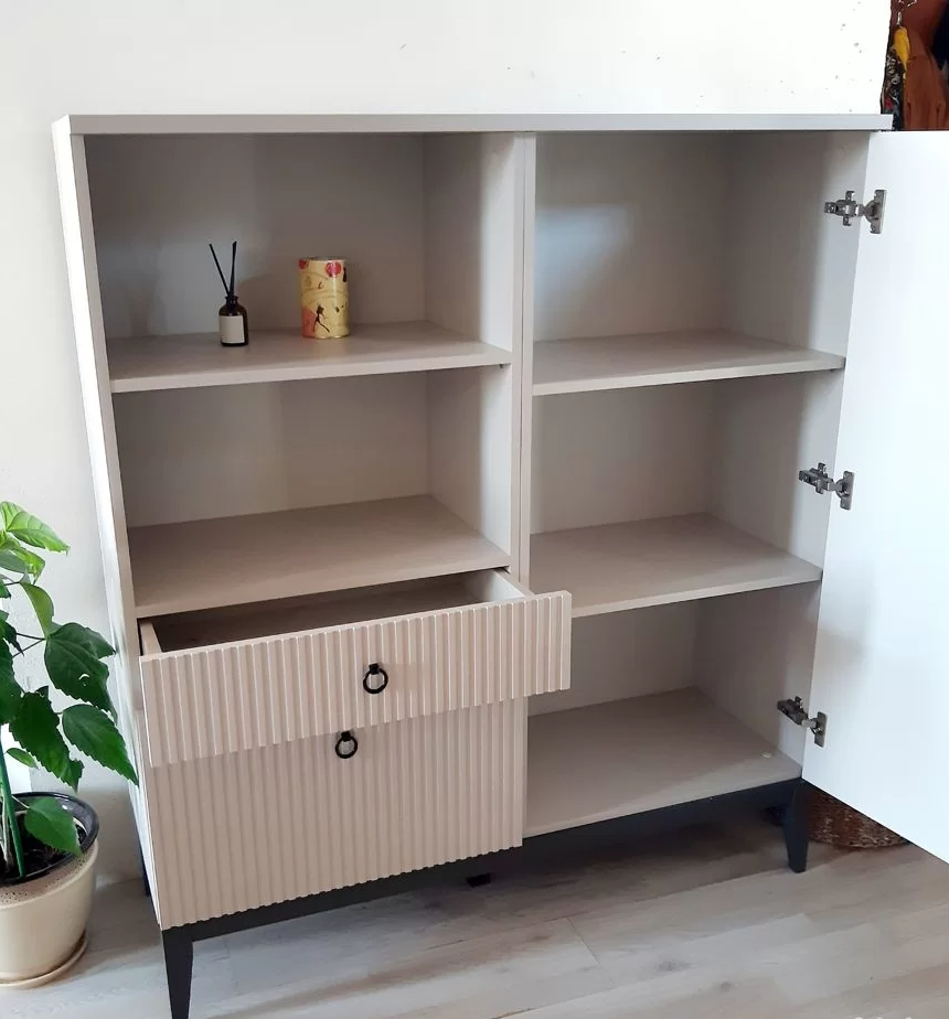 • Наполнение шкафа: полка в открытой части, три полки за высоким фасадом и 2 ящика (малый и большой).