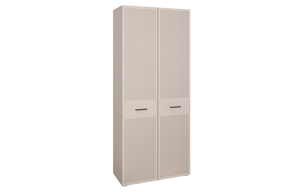 Элегантный двустворчатый шкаф с глухими распашными фасадами подойдет для прихожей, молодежной комнаты, спальни или гостиной. Черная матовая фурнитура хорошо сочетается с фрезерованными поверхностями оттенка «серый кашемир». Мягкий нейтральный цвет идеально впишется в большинство современных интерьеров, обстановку в стиле ар-деко. Внутри конструкция содержит узкую секцию с полками и отсек для одежды, с полочкой и выдвижной штангой. Петли бренда Makmart с доводчиками обеспечивают бесшумность и надежность эксплуатации. Мебель установлена на опорах, которые регулируются по высоте.