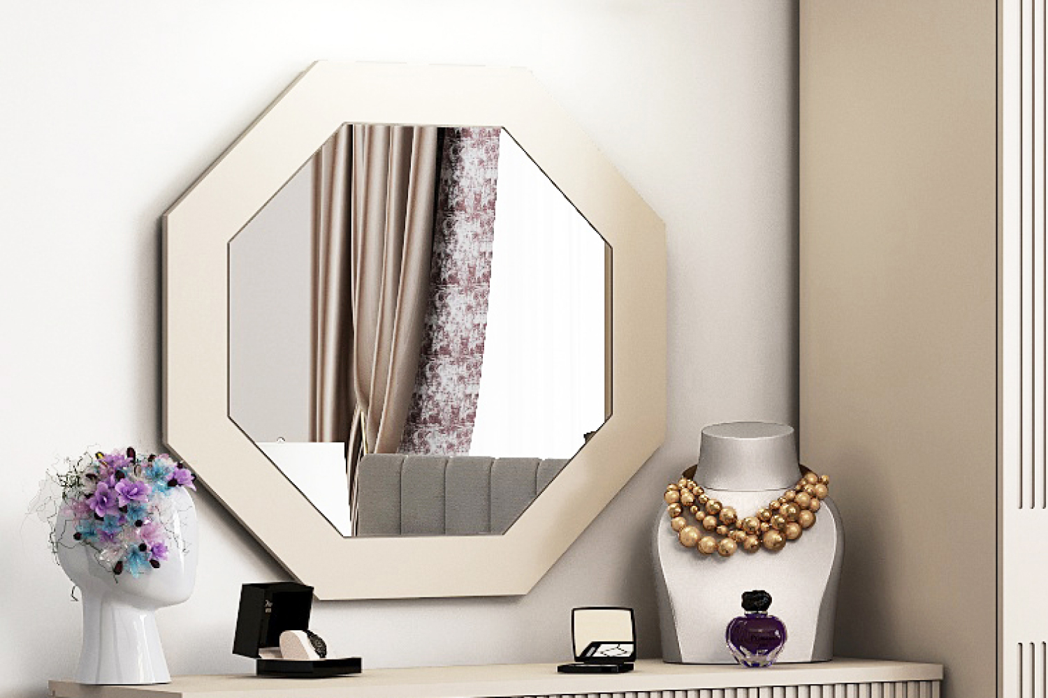 • Подложка зеркала выполнена из МДФ с декоративной фрезеровкой в виде полос по контуру и окутана плёнкой ПВХ;