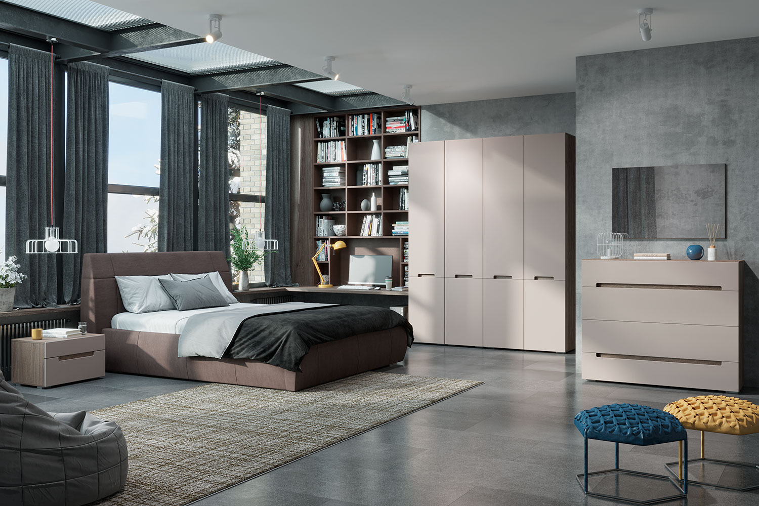 - Спальня в современном минималистичном стиле. Такая мебель универсальна и подойдет интерьерам в стилях эко, скандинавский, минимализм и лофт (в его более «легком» варианте);