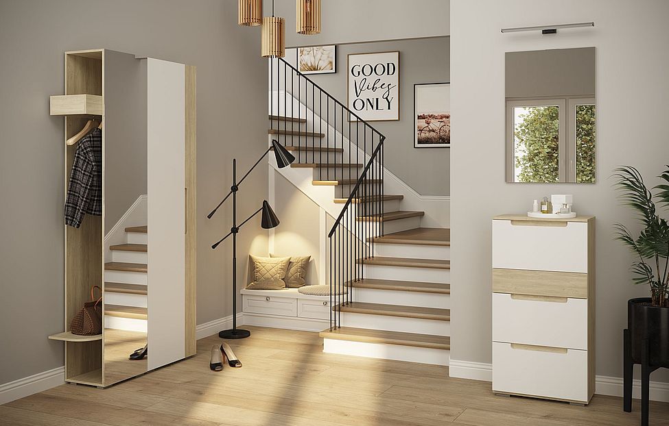 Современная и оригинальная прихожая займет почетное место в доме ценителей стиля сканди, лофт или минимализм. Светлые древесные текстуры разбавлены белыми матовыми фасадами, скрытые эргономичные ручки подчеркивают лаконичность дизайна. Необычные формы соседствуют с гладкими поверхностями.