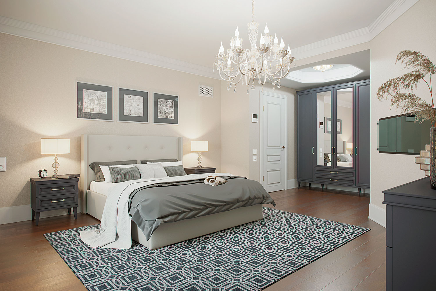 • Шкаф 4-створчатый с центральными зеркальными фасадами, 2 боковыми глухими фасадами и 2 выдвижными ящиками;