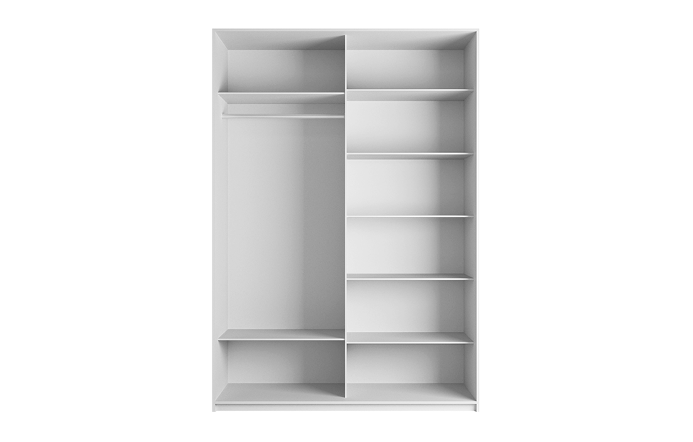 - За фасадами две одинаковых по размеру секции: одна с двумя полками и штангой, другая — с 5 полками;