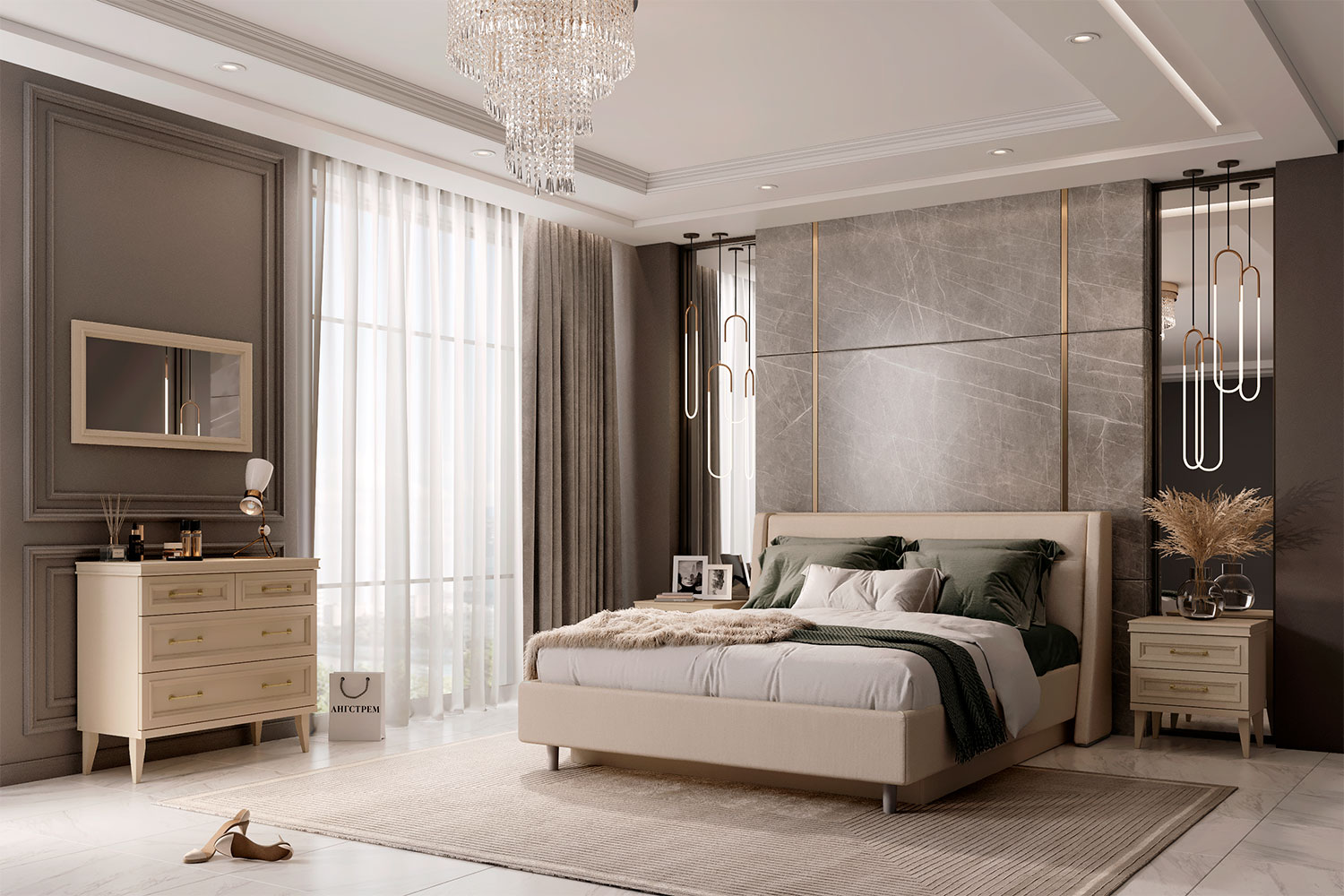• Обивка кровати: ткань Missoni 10 (Domiart). Цвет опор и короба — ярко-серый;