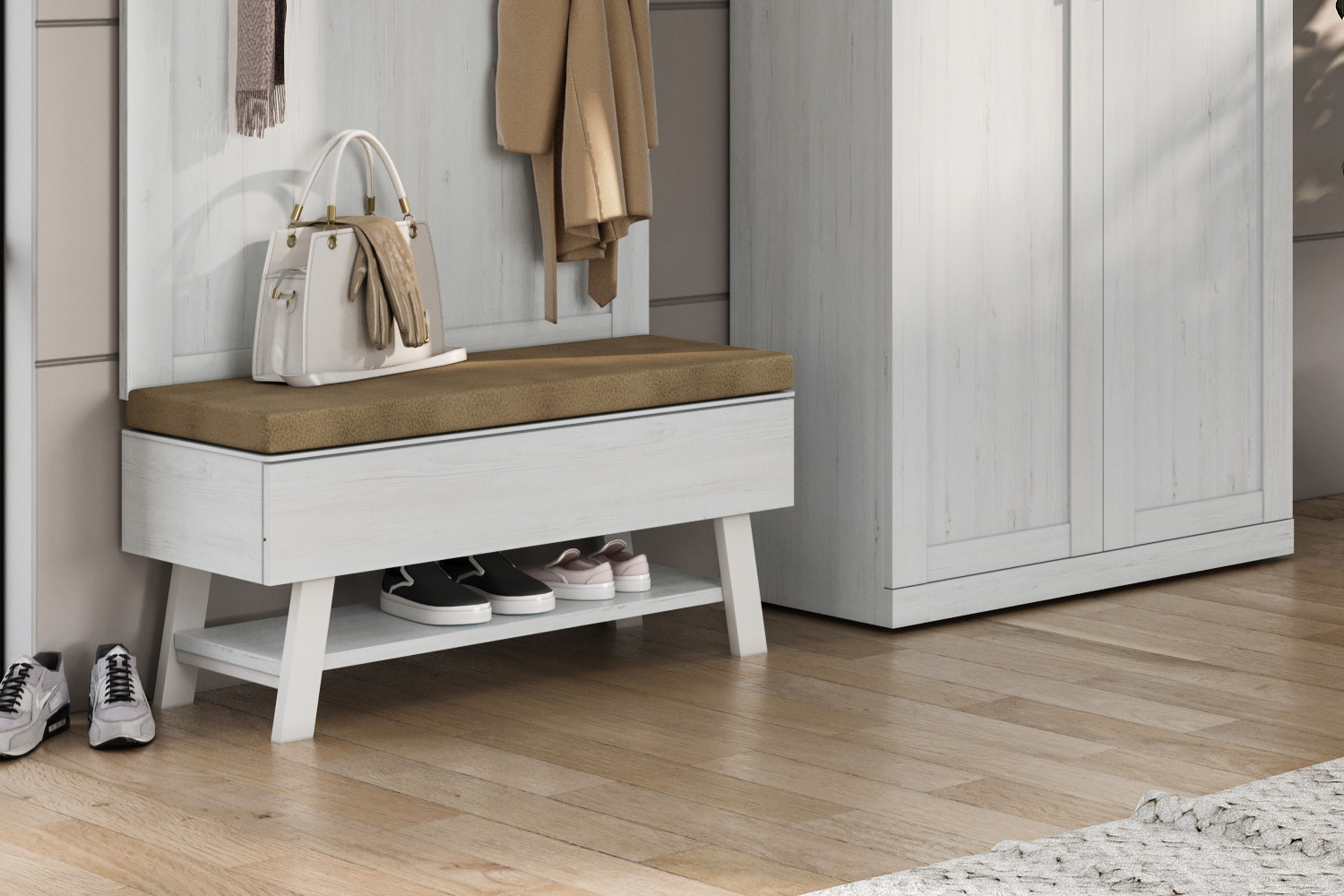 - Тумба для обуви с тремя секциями за откидными дверями;