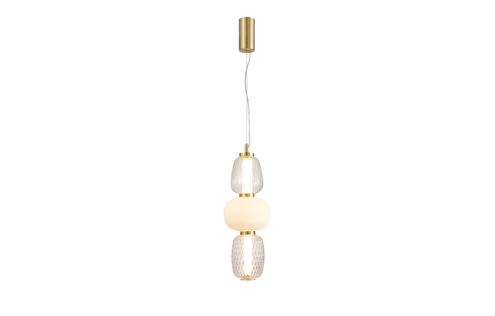 Чередование стеклянных плафонов разной формы, цвета и рисунка, а также цветовое решение каркаса в золоте создает насыщенный сложный и дорогой образ. Металлический каркас цвета золота, плафоны в виде бусин разнообразных форм из выдувного стекла двух видов - прозрачного и цвета опала.