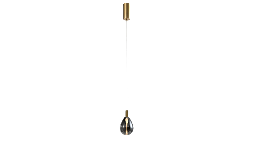 Особенностью подвесов Hopper является декоративный элемент в центре, формируемый в процессе выдувки стекла, который создает сложную и интересную форму плафона, становится основой его неповторимого облика. Плафон подсвечивается изнутри светодиодным источником света, создавая эмоциональное волнующее освещение. Подвес с каркасом в цвете латунь, с дымчато-серым плафоном, регулируемая высота.