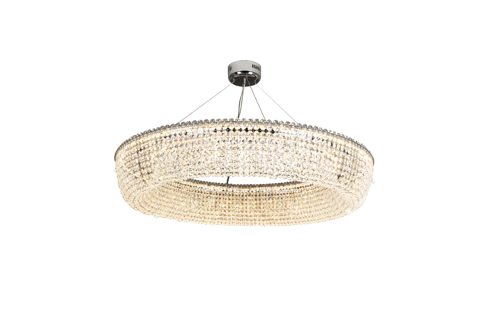 Коллекция Estrada имеет кольцевое строение. На каркас с внешней и внутренней стороны крепятся нити кристаллов, создавая эффектное оформление. Для освещения используется LED-лента с диммируемыми светодиодами, которая проходит внутри кольца. Игра света сквозь нити кристаллов добавляет роскоши и элегантности люстре. Металлический хромированный каркас, хрусталь высшего качества, встроенная лента со светодиодами внутри кольца, регулируемая высота, пульт управления.
