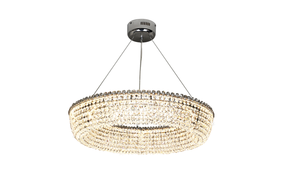 Коллекция Estrada имеет кольцевое строение. На каркас с внешней и внутренней стороны крепятся нити кристаллов, создавая эффектное оформление. Для освещения используется LED-лента с диммируемыми светодиодами, которая проходит внутри кольца. Игра света сквозь нити кристаллов добавляет роскоши и элегантности люстре. Металлический хромированный каркас, хрусталь высшего качества, встроенная лента со светодиодами внутри кольца, регулируемая высота, пульт управления.