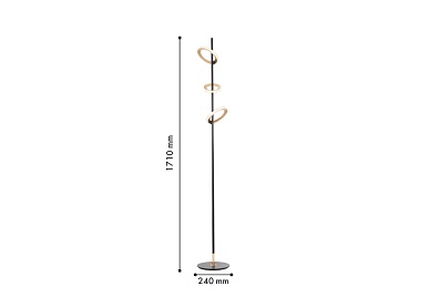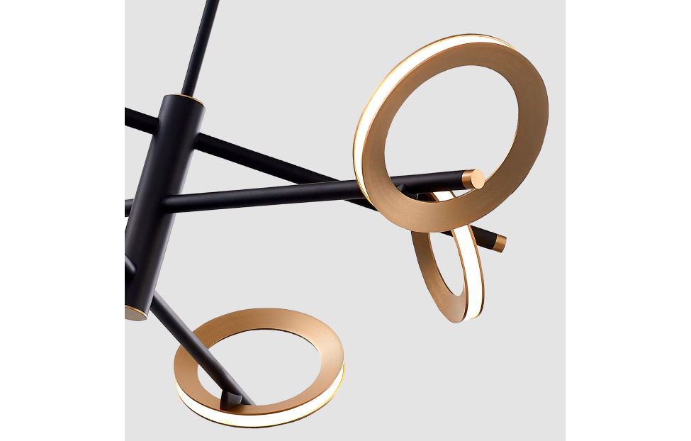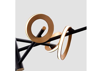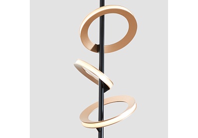 Коллекция Jongleur демонстрирует искусство баланса и динамики, где каждый элемент словно находится в постоянном движении. В качестве плафонов использованы объемные кольца цвета матовой латуни, которые светятся по периметру с помощью встроенной LED-ленты. Они закреплены под разным углом к тонкому черному каркасу светильника, будто вращаются вокруг основания, словно цирковые обручи хула-хуп. Регулируемая высота.