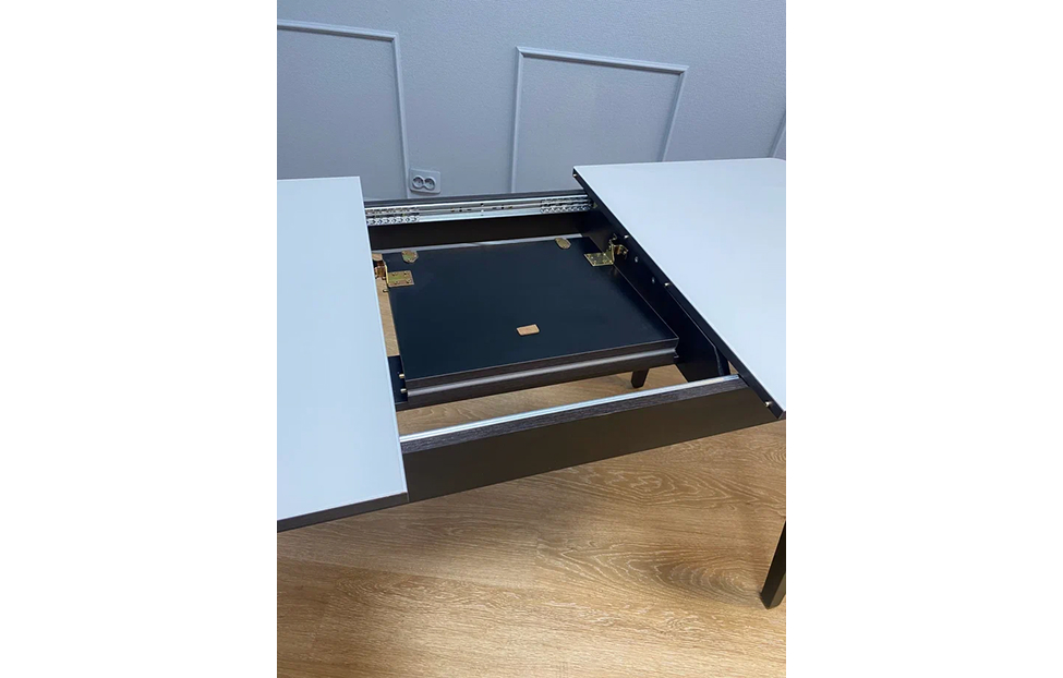 Синхронный механизм раскладки позволяет легко раздвинуть стол одной рукой любому члену семьи. Вставка с материалом столешницы оставляет стол монолитным в разложенном состоянии. Стол максимально устойчив благодаря особому, усиленному креплению опор и регулировочным винтам. Благодаря толстым опорам из массива бука, мощным угловым стяжкам и 2 шпилькам на каждой опоре - стол стоит монолитно на любой, даже неровной поверхности. Для дополнительной устойчивости используются регулировочные винты на концах опор.
