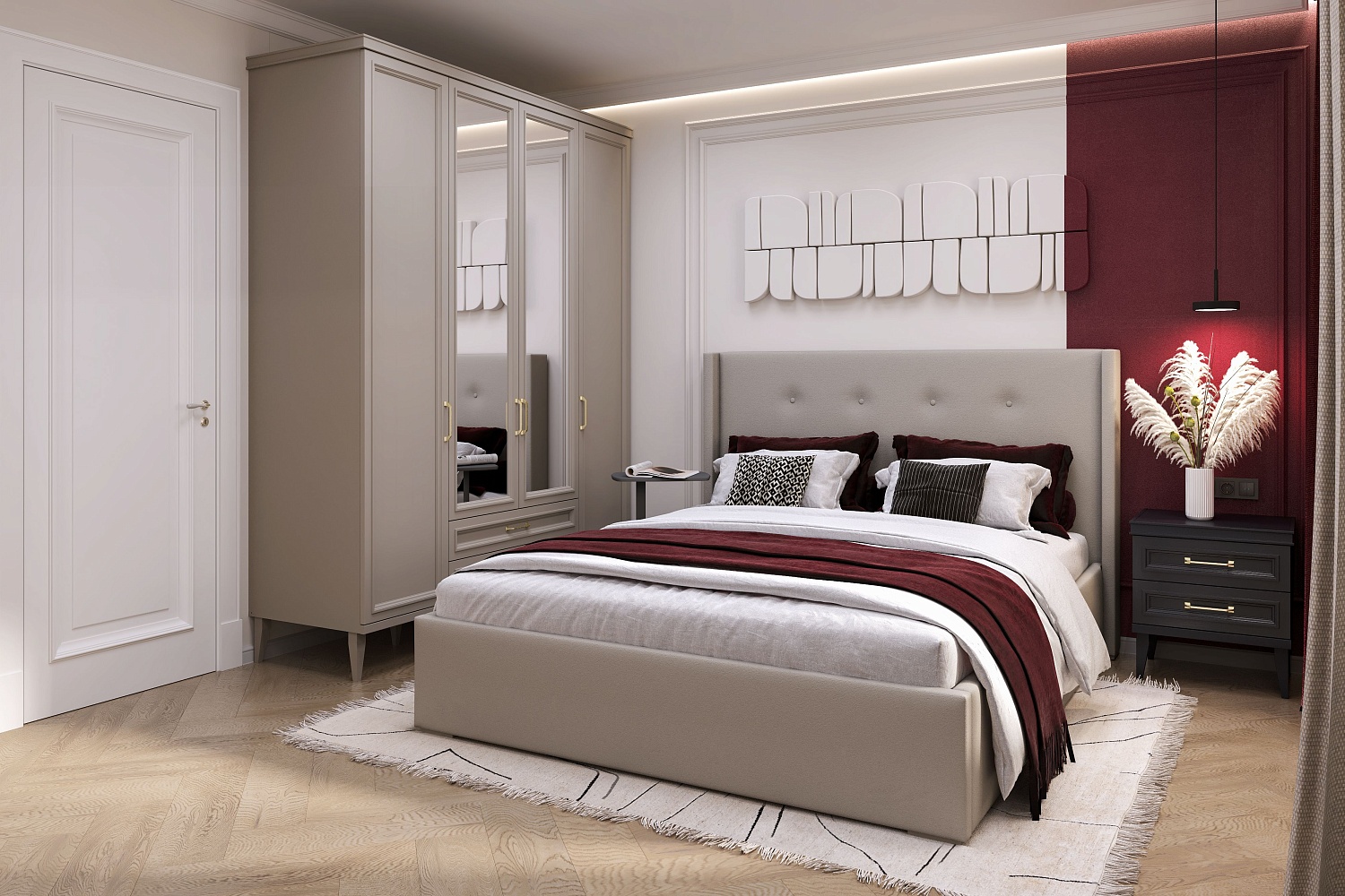 • Шкаф 4-створчатый с центральными зеркальными фасадами, 2 боковыми глухими фасадами и 2 выдвижными ящиками;