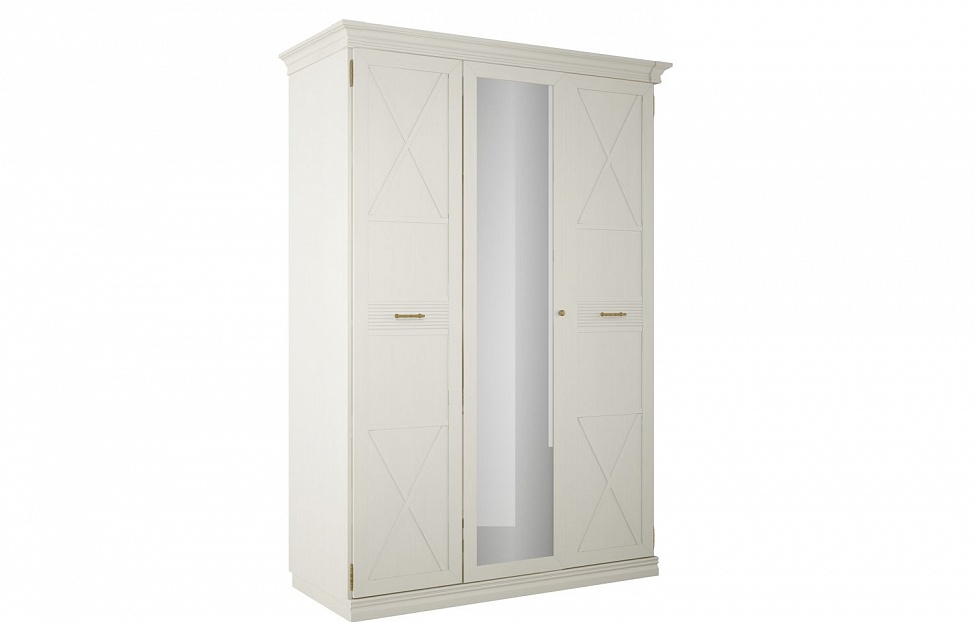 Элегантный трехдверный платяной шкаф станет прекрасным решением для оформления детской, молодежной комнаты, прихожей, спальни, гостиной в стиле кантри или неоклассика. Рамочные фасады украшены горизонтальной фрезеровкой и легкими, изящными линиями фахверков, выдержанные соответствующим образом карниз и цоколь дополняют внешний облик мебели. Матовые поверхности текстурированы под дерево и окрашены в светлый оттенок «валенсия». Строгую симметрию изделия подчеркивает центральная зеркальная вставка. Завершающим штрихом служит фурнитура с покрытием под «сатиновое золото».