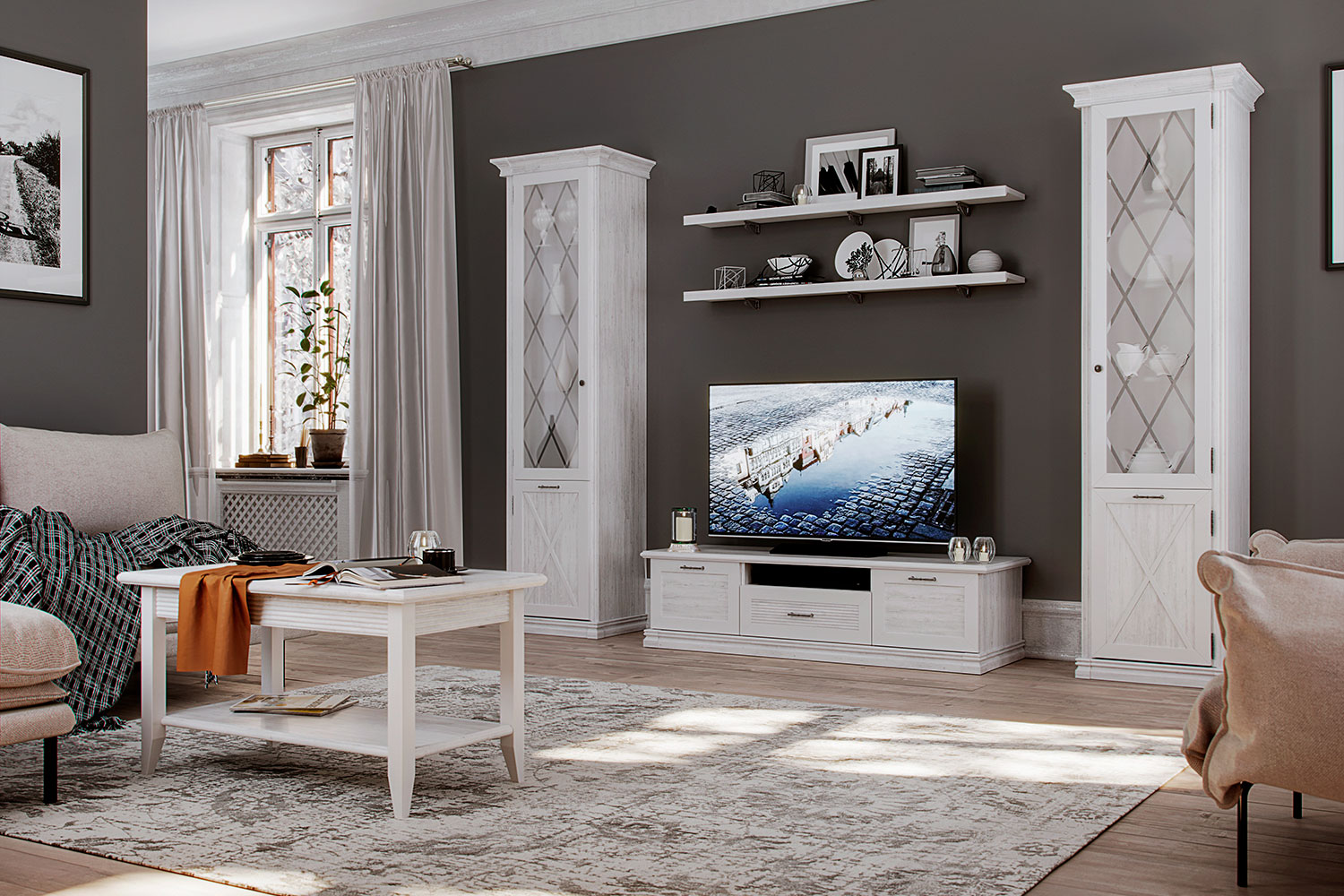 Гостиная состоит из двух шкафов-витрин, компактной ТВ-тумбы с тремя вместительными отделениями и двух полок. Композицию обрамляют колонны — их также можно установить в середине между модулями. Мебельные механизмы оснащены демпферами для плавного и бесшумного закрывания. Скрытые направляющие позволяют максимально задействовать внутреннее пространство и обеспечить надежную фиксацию выдвижных ящиков.