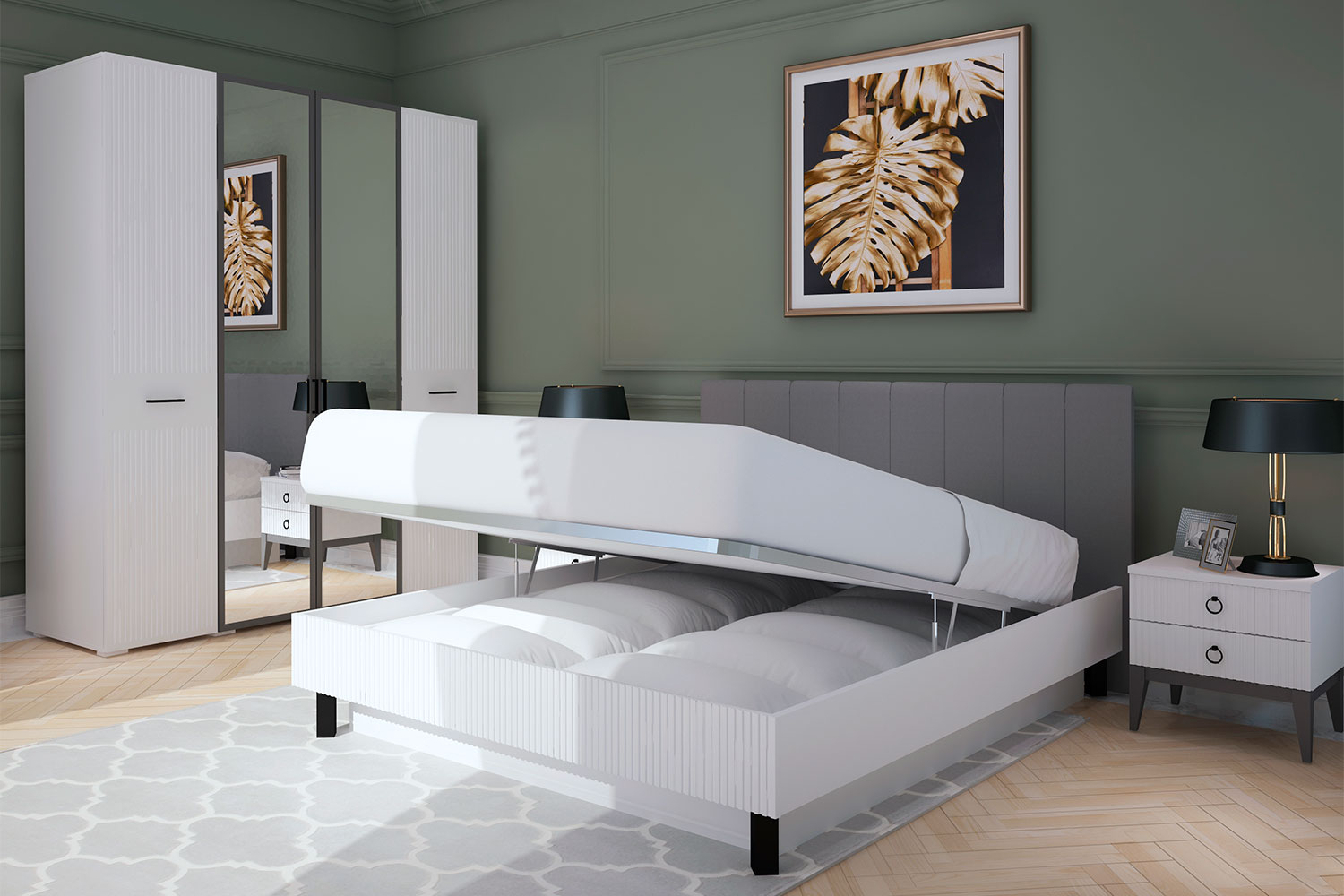 • Для хранения в спальне есть большой шкаф с зеркалом элегантного пепельного оттенка «графит», что придаёт дополнительный шарм коллекции;