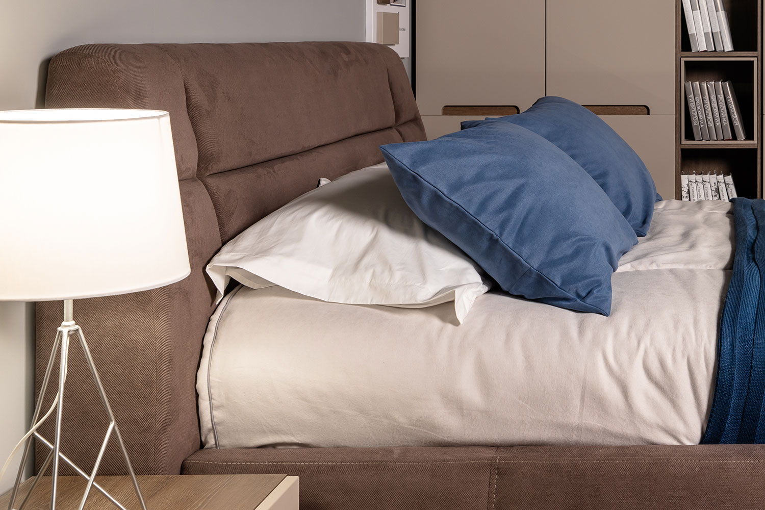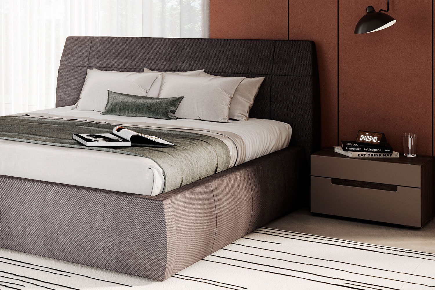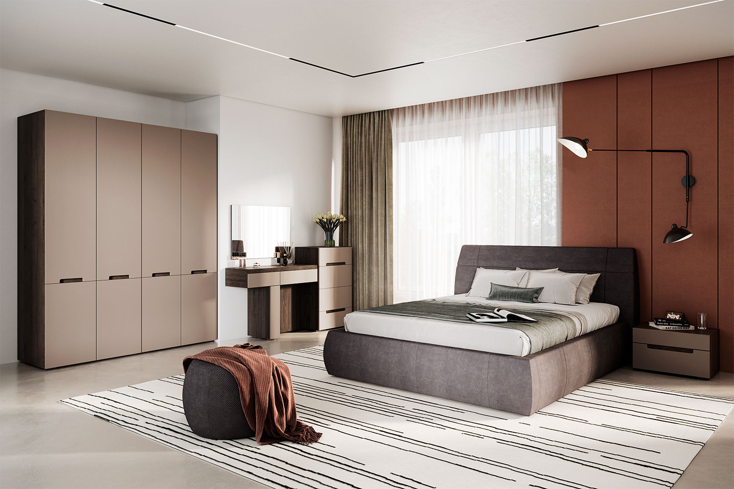 В зависимости от стиля, который вы хотите создать в вашем доме, можно дополнительно подобрать минималистичные торшеры в светлых оттенках, простое зеркало и стеллажи — для эко или скандинавского стилей, аксессуары из металла, стекла или дерева — для «легкого» лофта, графичные постеры — для минималистичного интерьера. Конечно же, советуем не забыть про туалетный столик и удобный матрас.